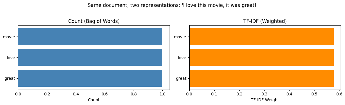Count vs. TF-IDF. Same sparsity structure (same zeros), different values. TF-IDF downweights words that appear everywhere and upweights distinctive words — a better signal for classifiers.