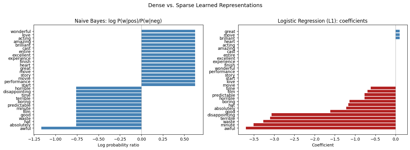 Learned sparsity. L1 regularization lets Logistic Regression discover which features don’t matter and zero them out. This is compression learned from data, not just a structural property of the input. Naive Bayes, by contrast, always produces dense parameter estimates.