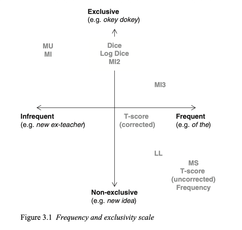 Statistical such as Pointwise Mutual Information (PMI), t-score, or log-likelihood quantify this likelihood of association by comparing observed bigram frequencies to expected frequencies under an independence assumption.